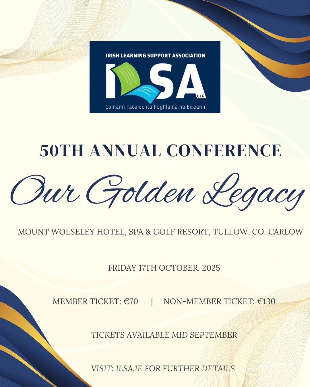 I.L.S.A. Irish Learning Support AssociationCumann Tacaíochta Foghlama na hÉireann Company Limited by Guarantee Empowering educators to support learners ILSA Membership 2025-2026 is now available There are two forms of membership : School Membership and Individual MembershipMembership is for the academic year and ends August 31st annually Further information on our membership page ILSA 50th Annual Conference Fri Oct 17th Mount Wolseley Hotel, SPa and Golf Resort Buy Conference Tickets here